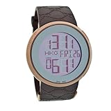 Brown PVD stainless steel case with a brown "GG" rubber strap. Silver-tone digital dial with chronograph and date display. Alarm. Fixed stainless steel bezel.Quartz movement. Scratch resistant sapphire crystal. Case diameter: 44 mm. Deployment clasp. Water resistant at 30 meters (100 feet). Gucci 114 I-Gucci Mens Watch YA114209Rose-gold styling and the digital world meet in the GUCCI Men's YA114209 Digital Watch. The large rose-gold-toned stainless steel case and bezel and handsomely paired with a brown dial face with digital displays for the time and date, and the synthetic sapphire window ensures this watch will look great after years of wear. A rich brown rubber band stamped with "GG" complements the rose-gold tones of the case, while a rose-gold deployment buckle, featuring the Gucci name, holds this timepiece comfortably in place. This stylish Gucci timepiece relies on Swiss quartz movement and is water resistant to 99 feet (30 meters). Read more