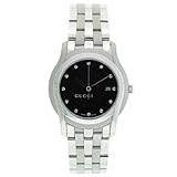 Stainless steel case with a steel link bracelet. Fixed stainless steel bezel. Black dial with silver-tone hands and diamond hour markers. Quartz movement. Scratch resistant sapphire crystal. Steel crown. Screw in case back. Case diameter: 38 mm. Case thickness: 8 mm. Deployment clasp. Water resistant at 30 meters / 100 feet. Gucci 5505 Stainless Steel Black Ladies Watch YA055213. Read more